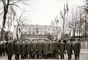 Фотоснимок Михаила Белявцева, сделанный в ноябре 1978 года запечатлел практически весь личный состав отдела милиции, который вскоре после ухода сумевшего прославиться «железной хваткой» в борьбе преступностью младшего лейтенанта Григория Сергеевича Короткого возглавил присланный на усиление из Унечи Владимир Михайлович Дубинин. Как и положено командиру подразделения Владимир Михайлович занял свое место на правом фланге, выделяясь своим ростом и неплохой выправкой. По левую руку от него, пользовавшийся непререкаемым авторитетом у сотрудников отдела заместитель начальника, замполит Н.П.Пеклич. Двигаясь от него в сторону левого фланга обращаешь внимание на подтянутых бравых офицеров: заместителя начальника РОВД С.П.Козлова, инспектора пожарного надзора И.Ф.Поволяко, инспектора уголовного розыска И.А.Кузенкова , участкового инспектора С. Позднякова. Суражане со «стажем» без труда узнают стоящих с мегафонами начальника ГАИ И.А. Лагутенко и инспектора дорожного надзора Н. Г.Власенко.