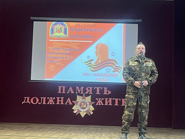 В Суражском педагогическом колледже имени А.С.Пушкина с особым трепетом прошло торжественное открытие месячника военно-патриотического воспитания. Это событие стало не просто началом цикла мероприятий, но и воткрытым диалогом о ценностях, которые формируют нашу идентичность и определяют наше будущее. Особую значимость встрече придали гости – социальный координатор фонда «Защитники Отечества» Н.А.Стасевич и ветераны специальной военной операции Богданов Павел Юрьевич и Карчевский Сергей Геннадьевич. Их присутствие наполнило зал не только авторитетом, но и живым примером стойкости и преданности.