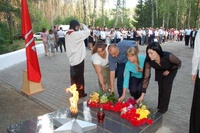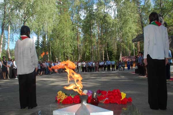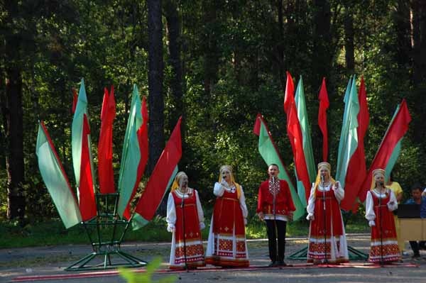 К подножию воинского обелиска представители двух государств, отмечающих сегодня день единения народов России и Беларуси возлагают венки и живые цветы ,в память о подвиге воинов-красноармейцев затихают в минуте молчания все собравшиеся на символической границе двух славянских государств.